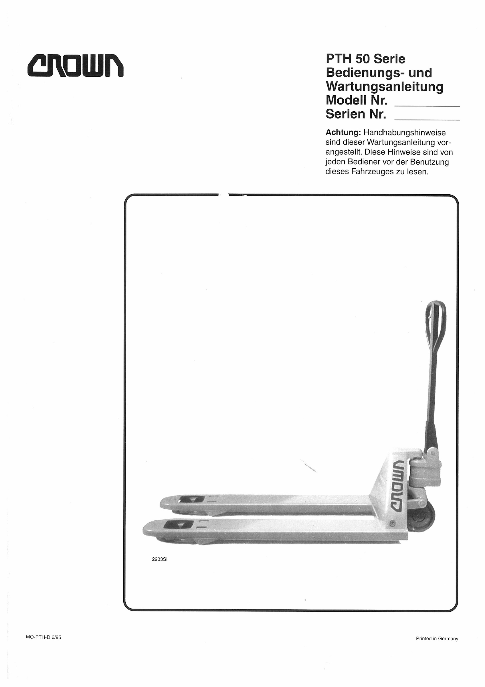 Crown Betriebsanleitung PTH 50 und Wartungsanleitung